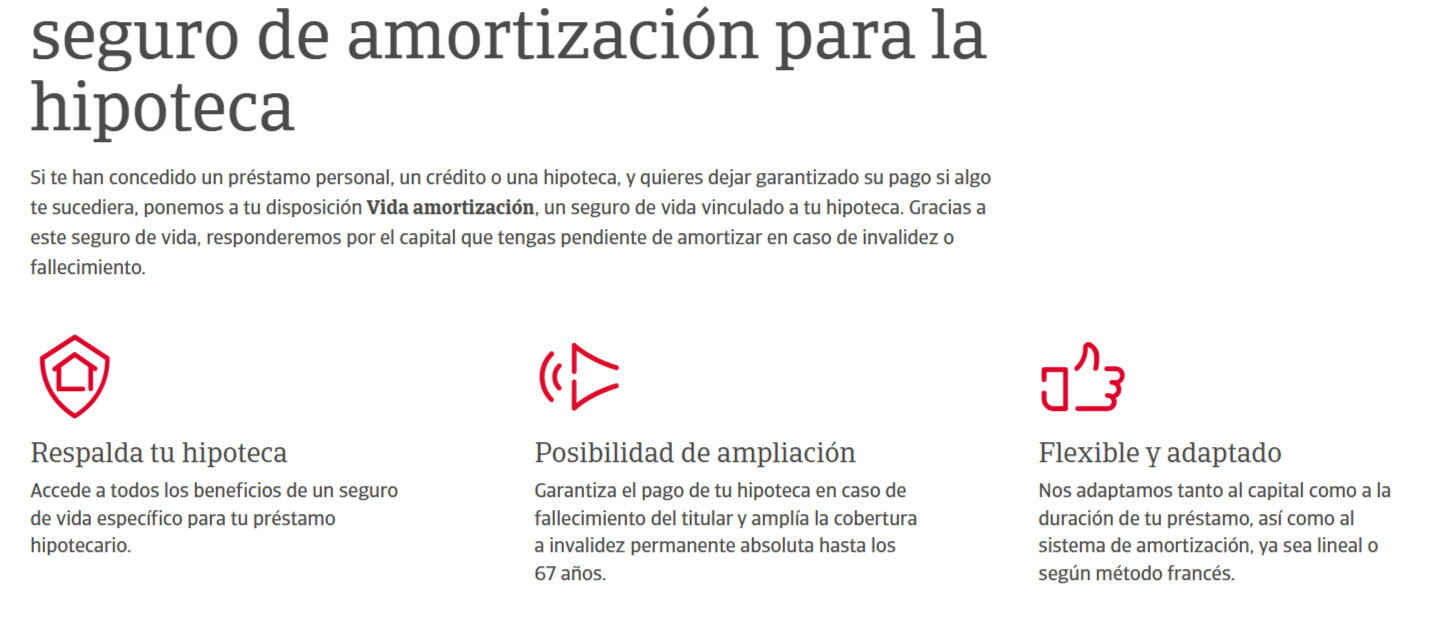 El seguro de amortización se contrata con la misma duración que el préstamo, con un periodo mínimo y máximo de entre 5 y 30 años, y el capital asegurado va decreciendo hasta que se amortiza la hipoteca.Coberturas: